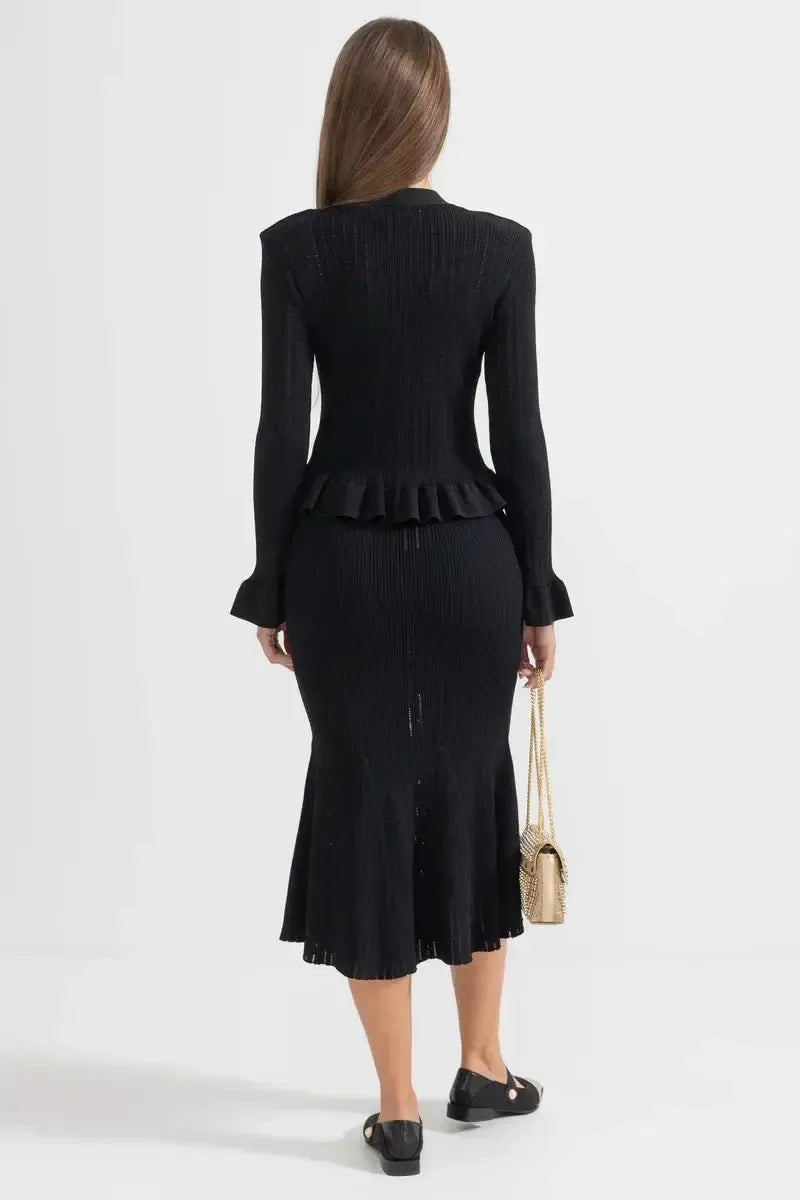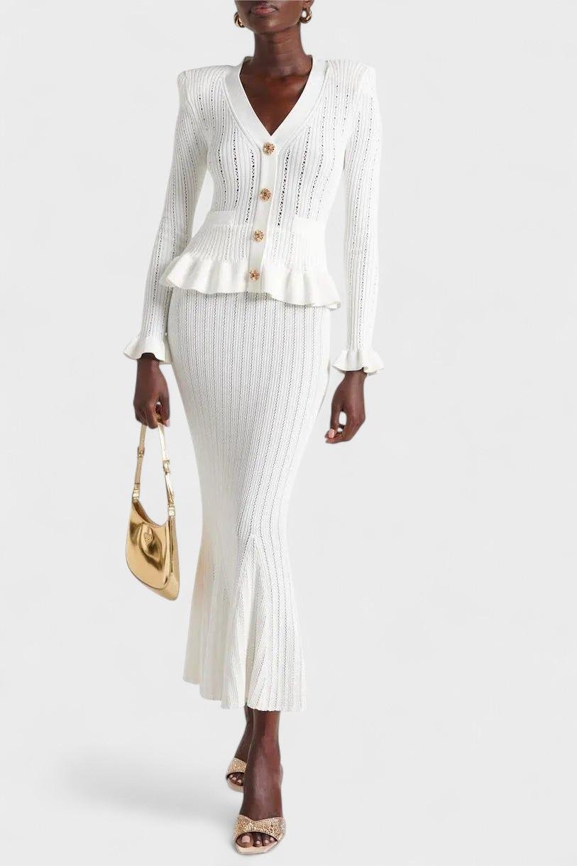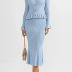 Prudence | Conjunto irradia elegância intemporal e o orgulho da herança da marca em cada costura. O conjunto consiste numa cardigan ajustada de decote em V com delicados volantes nas mangas e botões inspirados no vintage, juntamente com uma saia midi de corte A de cintura alta, tudo feito em lã de primeira qualidade e executado com costura minuciosa. A construção suave e respirável proporciona conforto durante todo o dia, enquanto os detalhes bem pensados e o corte elegante garantem uma silhueta sofisticada que transita facilmente do casual ao formal. Com disponibilidade limitada, o Prudence | Conjunto oferece um verdadeiro apelo para colecionadores e um investimento intemporal no guarda-roupa que perdura ano após ano. A cintura alta e o corte A criam uma silhueta intemporal e lisonjeira que se mantém ao longo dos anos.